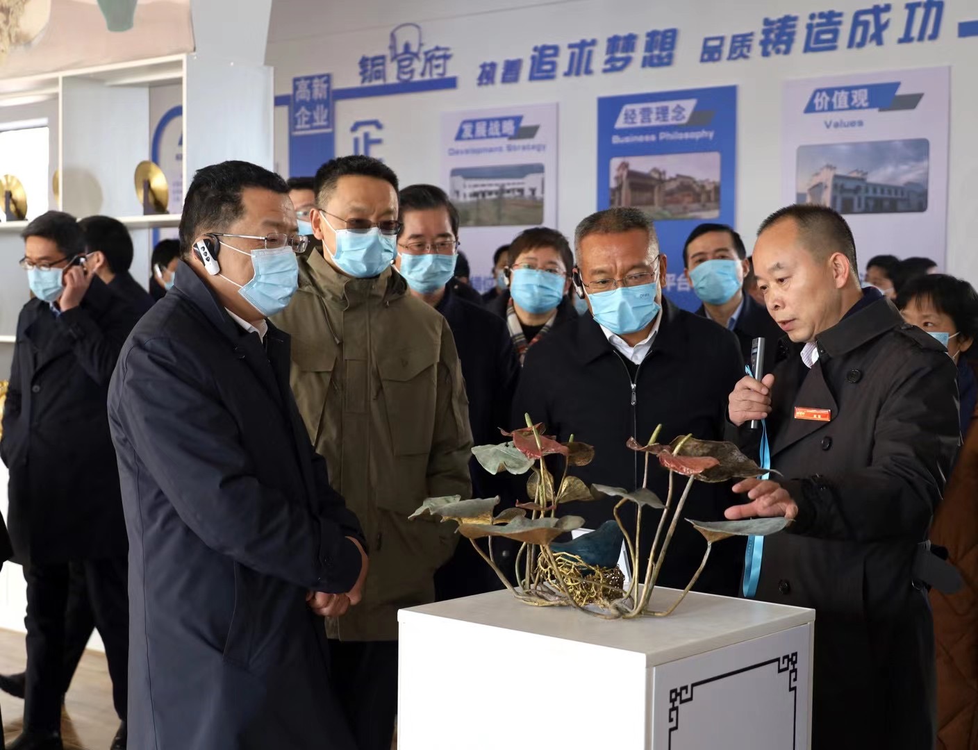 1月12日下午,中共銅陵市委十屆十四次全體(擴(kuò)大)會(huì)議期間,市委書(shū)記丁純,市委副書(shū)記、市長(zhǎng)胡啟生及各市直部門(mén)、開(kāi)發(fā)園區(qū)和縣區(qū)主要負(fù)責(zé)人等近百人,現(xiàn)場(chǎng)觀摩銅官府銅藝產(chǎn)業(yè)園。全體委員還集中參觀了全國(guó)景泰藍(lán)職業(yè)技能競(jìng)賽參加決賽選手作品以及趙敏的寫(xiě)真銅藝作品等。