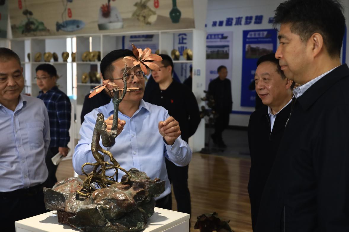 公司負(fù)責(zé)人郭飛陪同參觀并匯報(bào)了企業(yè)生產(chǎn)經(jīng)營、市場銷售、非遺技藝傳承等情況。調(diào)研組深入車間詳細(xì)了解銅工藝品制作技藝、工藝傳承創(chuàng)新,曲福田副主任對我公司把傳統(tǒng)工藝和現(xiàn)代創(chuàng)意有機(jī)結(jié)合做法給予充分肯定,并就優(yōu)化產(chǎn)品結(jié)構(gòu)、提升產(chǎn)品競爭力與公司負(fù)責(zé)人進(jìn)行交流探討,他希望銅官府進(jìn)一步強(qiáng)化品牌培育,用匠心延續(xù)銅工藝的“金”字招牌。